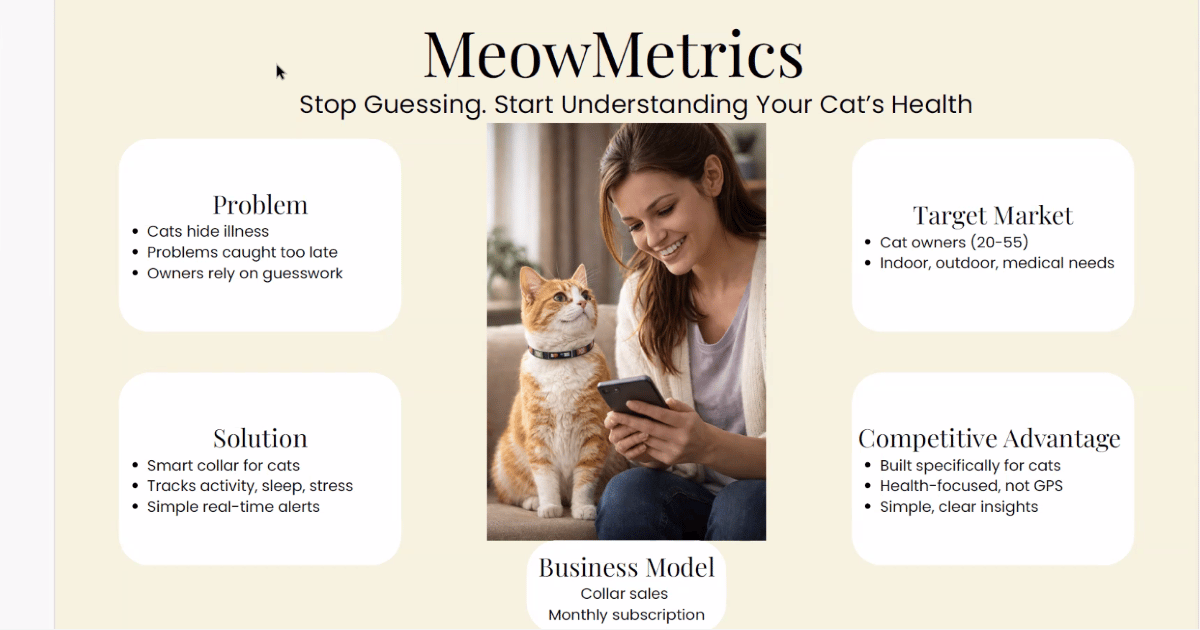 This image provided by Pee Dee Idea Challenge is the slide for MeowMetrics by Coastal Carolina student Willow DiGravio. This is an idea for a smart cat collar that monitors the wearer’s health. (PDB2B image by Pee Dee Idea Challenge)